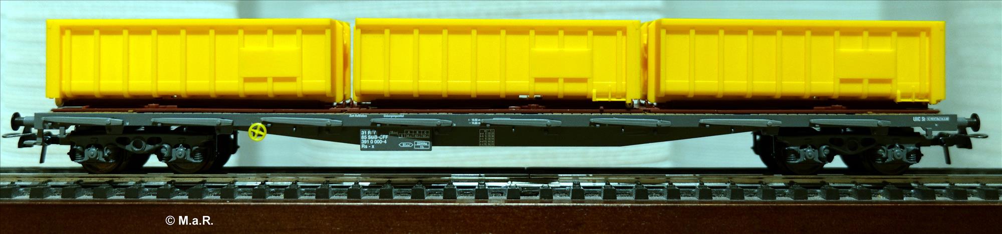| Produktbeschrieb | Flachwagen, 4-achsig, mit Klapprungen und gelben ACTS Abrollcontainern, ohne Aufschriften, vermutlich Vorserie |