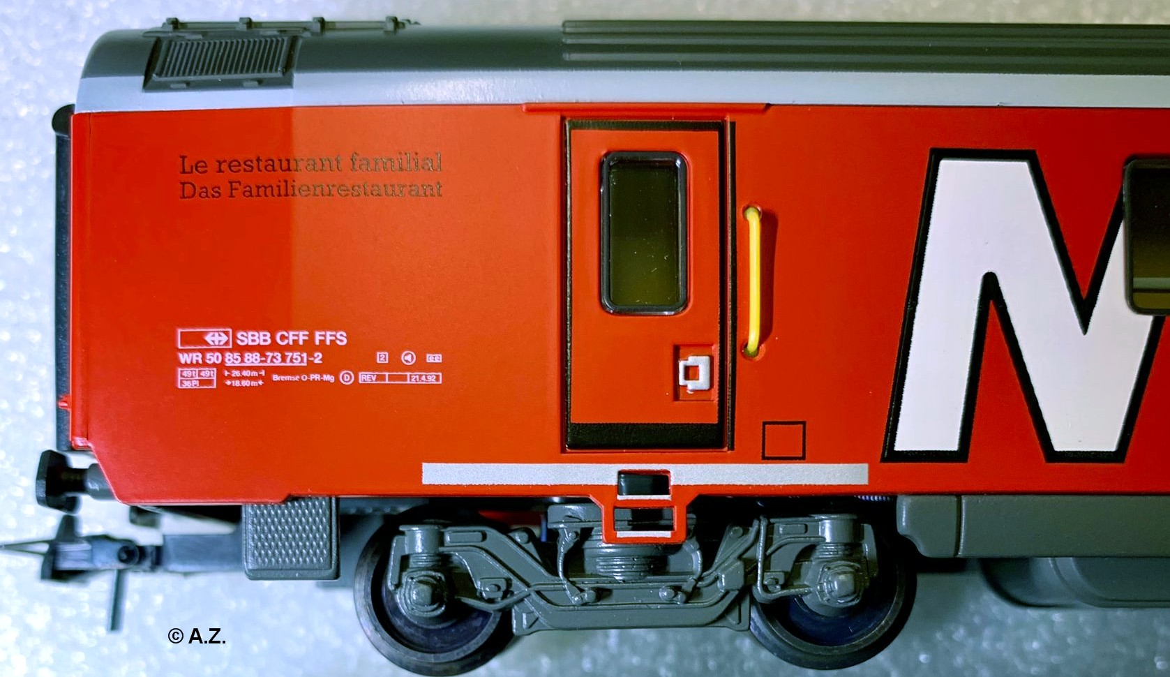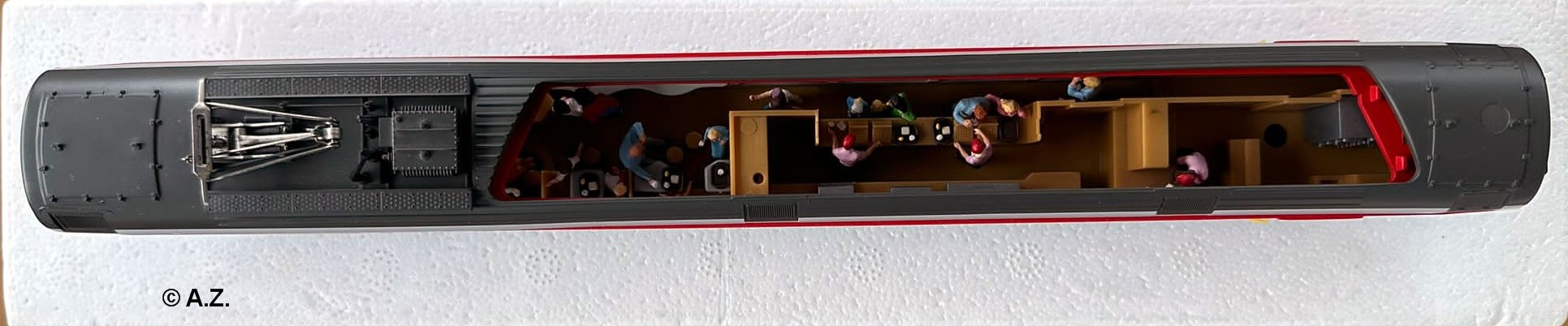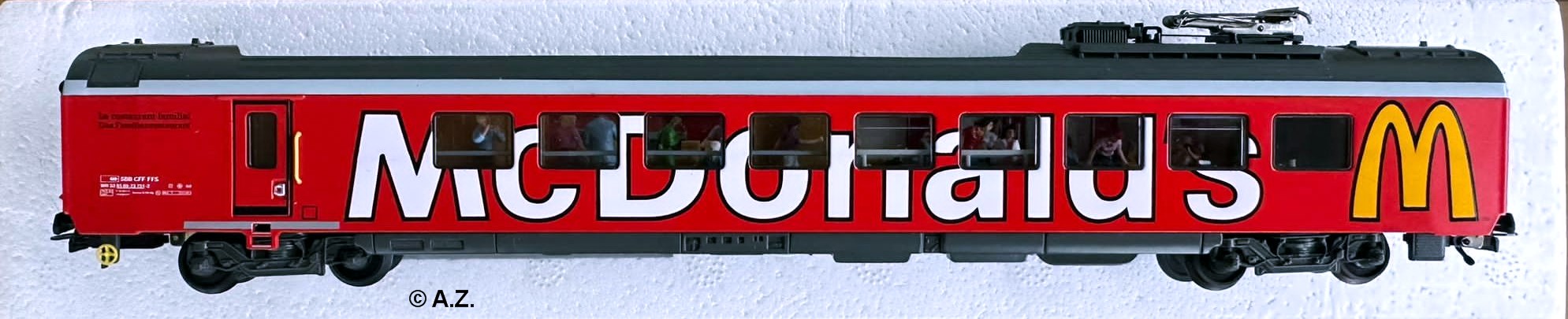 | Produktbeschrieb | Speisewagen, McDonald's mit offenem Dach, Kleinserie mit aufgeschnittenem Dach und Figuren, in Präsentations-Vitrine auf Fleischmann-Gleis und Holzsockel montiert, 30 Exemplare. |