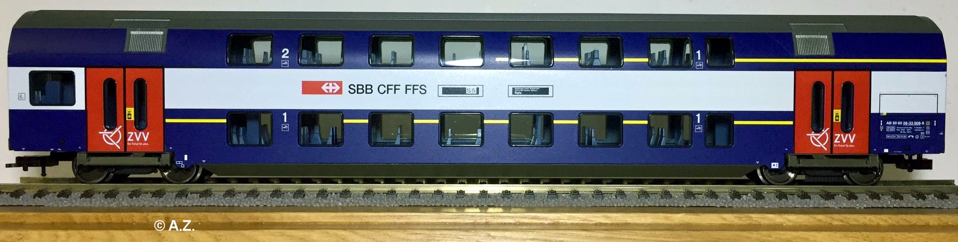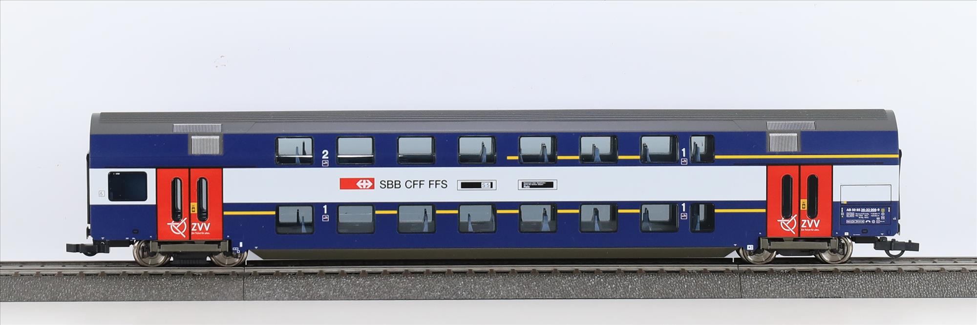 | Produktbeschrieb | Doppelstockwagen mit roten Türen auf Basis Fleischmann, Rarität, war möglicherweise nur bei Roundhouse in Zürich erhältlich |