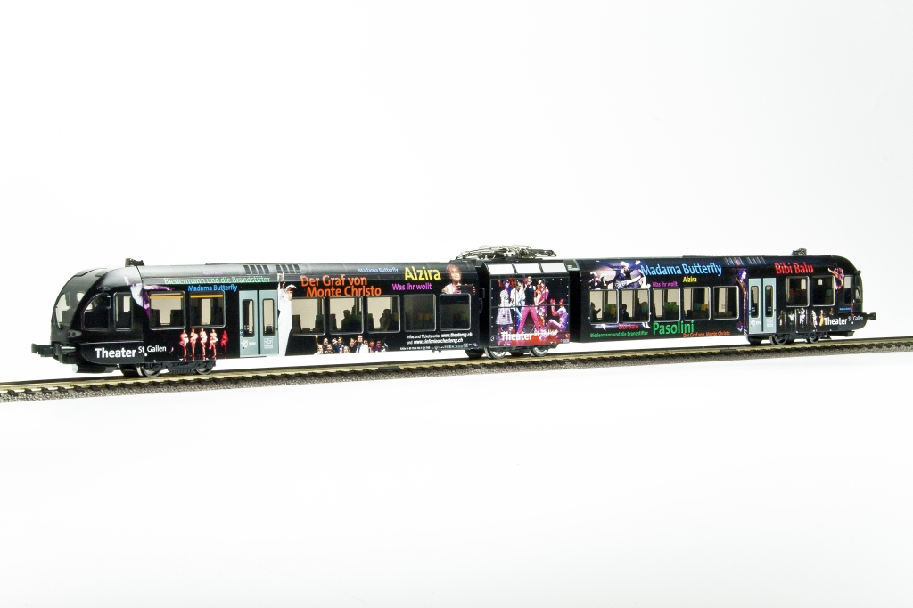 | Produktbeschrieb | Thurbo GTW 2/6 Theater St. Gallen, zwei Stromabnehmer, Gestaltung der Seitenwände unterschiedlich, Auflage ca. 100 Exemplare, aufgedruckte Betriebsnummer RABe 94 85 7526 725-7 CH-THB |